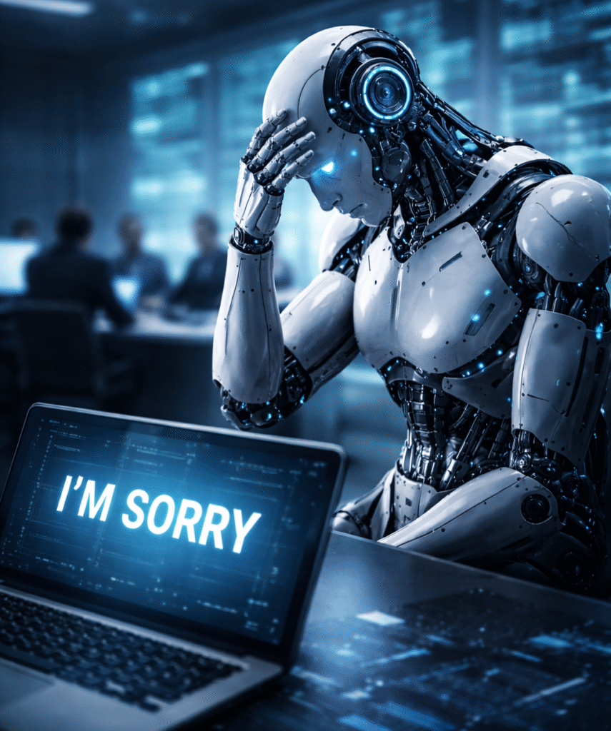الذكاء الاصطناعي هنا لم يُقدَّم بوصفه أداة، بل بوصفه وسيطاً أخلاقياً. هو الذي يعتذر، وهو الذي يُلام، وهو الذي يُطالَب بالتحسّن. أما الإنسان — فرداً ومؤسسة — فيبقى في الخلفية، بلا اعتذار، وبلا تحديد مسؤولية واضح.